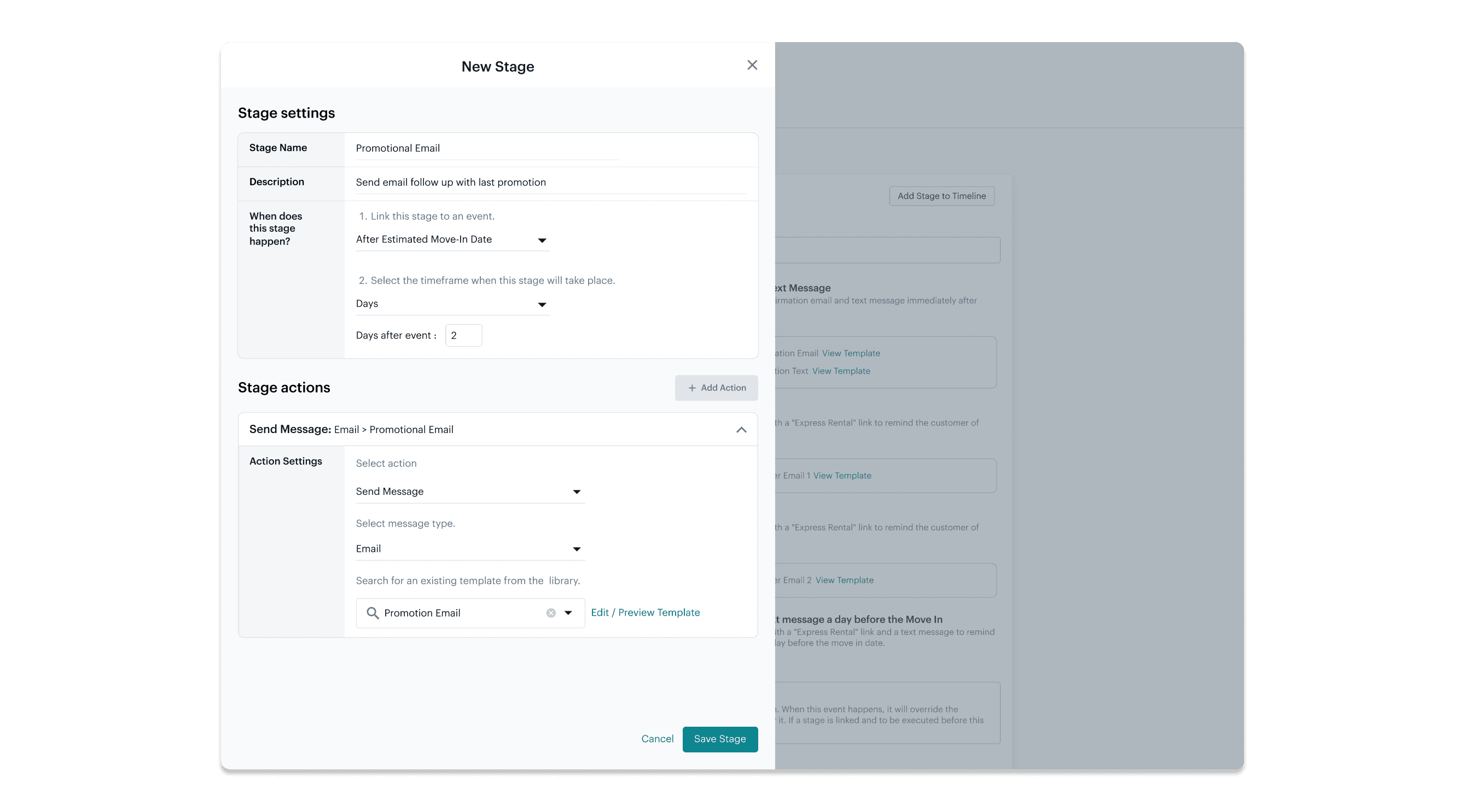 The stage is shown in an easy-to-read format where you can quickly see what will happen, when it’ll happen, and what messages or tasks are set to go out.